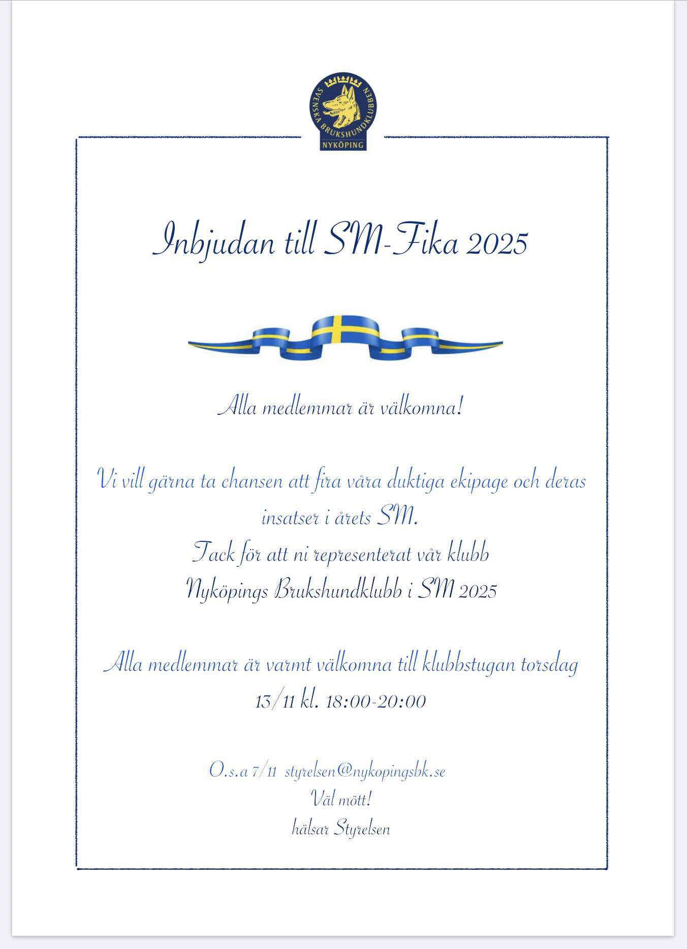 Vi samlas för en fika och uppmärksammar dom duktiga ekipage som representerat vårt NBK på årets SM!