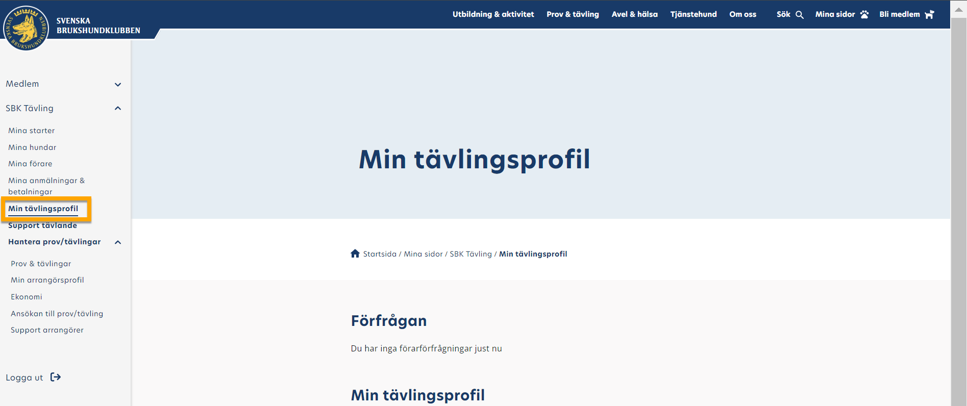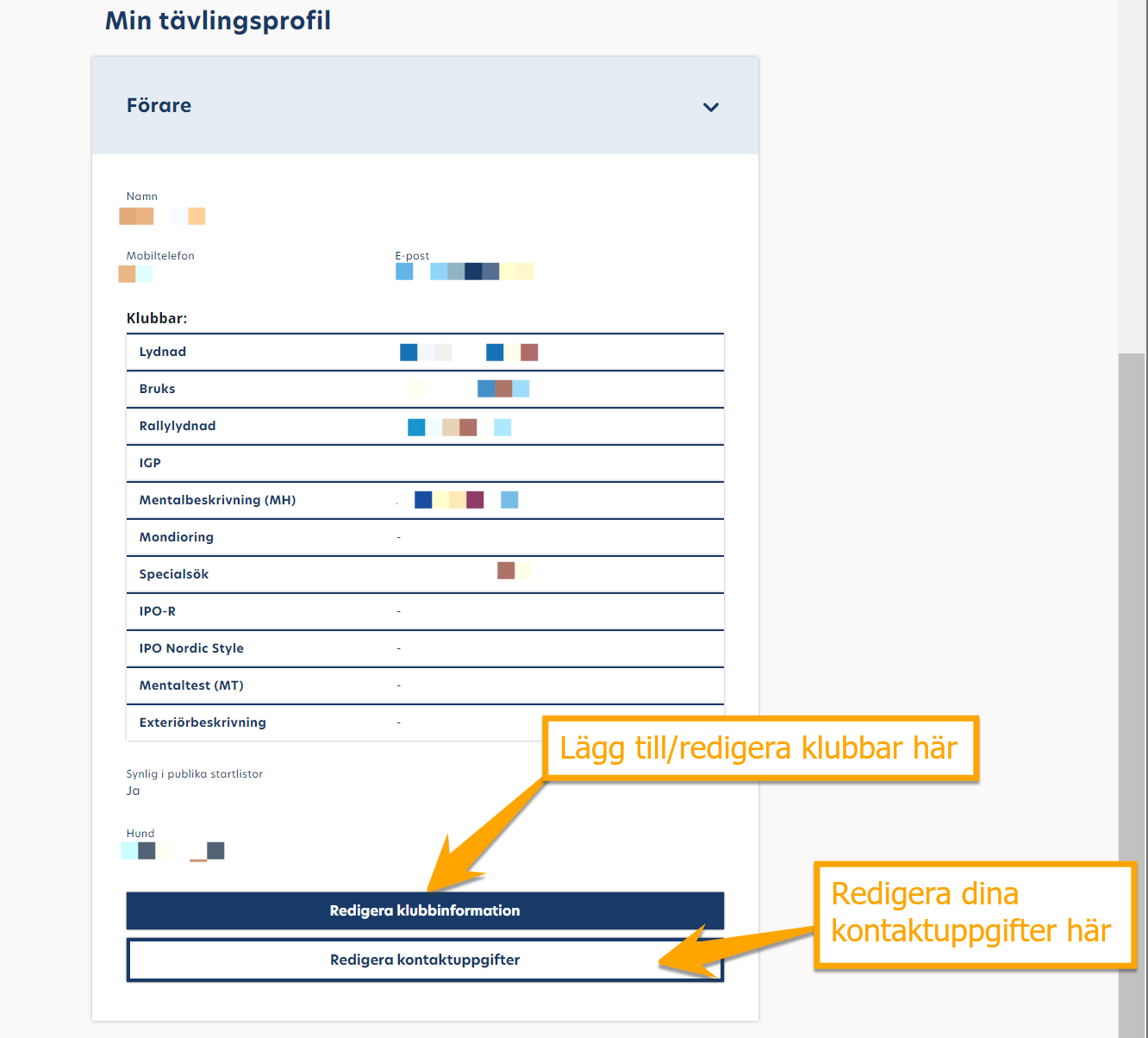 Här ser du dina uppgifter och vilka klubbar du angett att du tävlar för i olika grenar.