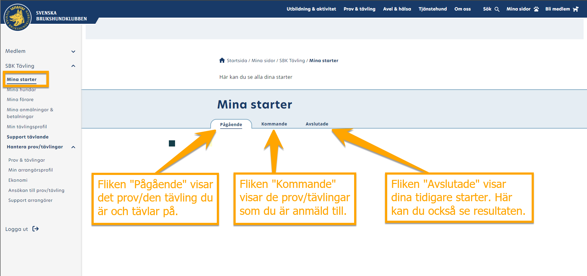 Klicka på respektive flik för att se dina aktuella, kommande och tidigare starter. Under fliken Avslutade kan du även se resultat från tidigare starter. Du klickar bara på knappen "Se resultat" och väljer vilken klass du vill se så får du upp alla resultat från det provet/den tävlingen.