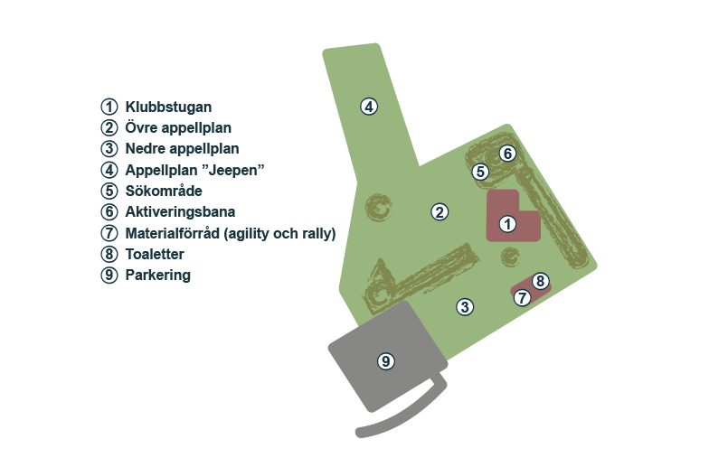 Lydnadshinder och bruksstegen hittar du ute på planerna, men vår agilitybana och rallylydnadtillbehör finns i ett låst hinderförråd (den gula kontainern).