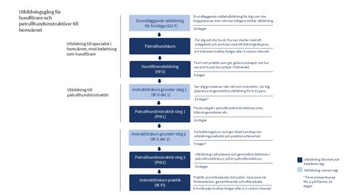 - Om allt som krävs för att söka instruktörsutbildning är uppfyllt skickar SBK:s tjänstehundsavdelning utbildningsplanen till den närmaste militärregionen, i förhållande till där individen är bosatt.